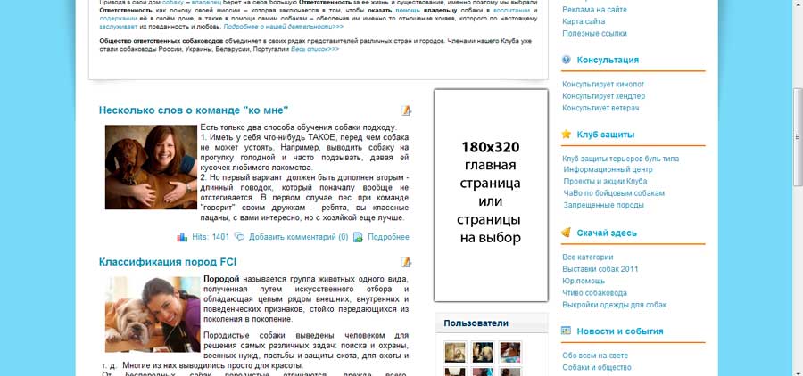 Общество ответственных собаководов существует уже более трех лет.На данный момент посещаемость сайта составляет от 1300 до 2200 уникальных посетителей в день (более 40 тысяч уникальных посетителей в месяц). И эта цифра неуклонно растет. Сайт и форум проиндексирован всеми крупными поисковиками (Yandex, Google, Rambler, Mail). В сообществе зарегистрировано более тысячи пользователей. Наша аудитория - собаководы.Профессионалы и любители, новички и люди со стажем. И направленность сайта позволяет говорить о таргетированной аудитории, активно занимающейся своими питомцами и заинтересованной в товарах и услугах четко определенной направленности (корма, игрушки, одежда, аксессуары для содержания, дрессировки и выставок, услуги хендлинга, дрессировки, ветеринарии, груминга и многое другое). Именно поэтому мы предлагаем Вам рассказать о Ваших товарах и услугах на страницах нашего портала и форума. Форматы размещения рекламы на сайте:На данный момент наш портал может предложить Вам несколько планов размещения Вашей рекламы. 1. Премиум - сквозной баннер 468х60 в шапке сайта. Варианты плана: Премиум Основной (показ ежедневно, нелимитированное количество показов)....................... 7.000 руб./неделя Премиум Рабочие дни (показ только по рабочим дням, нелимитированное количество)........... 5.000 руб./неделя Премиум Выходные дни (показ только по выходным дням, нелимитированное количество)..... 3.000 руб./неделя